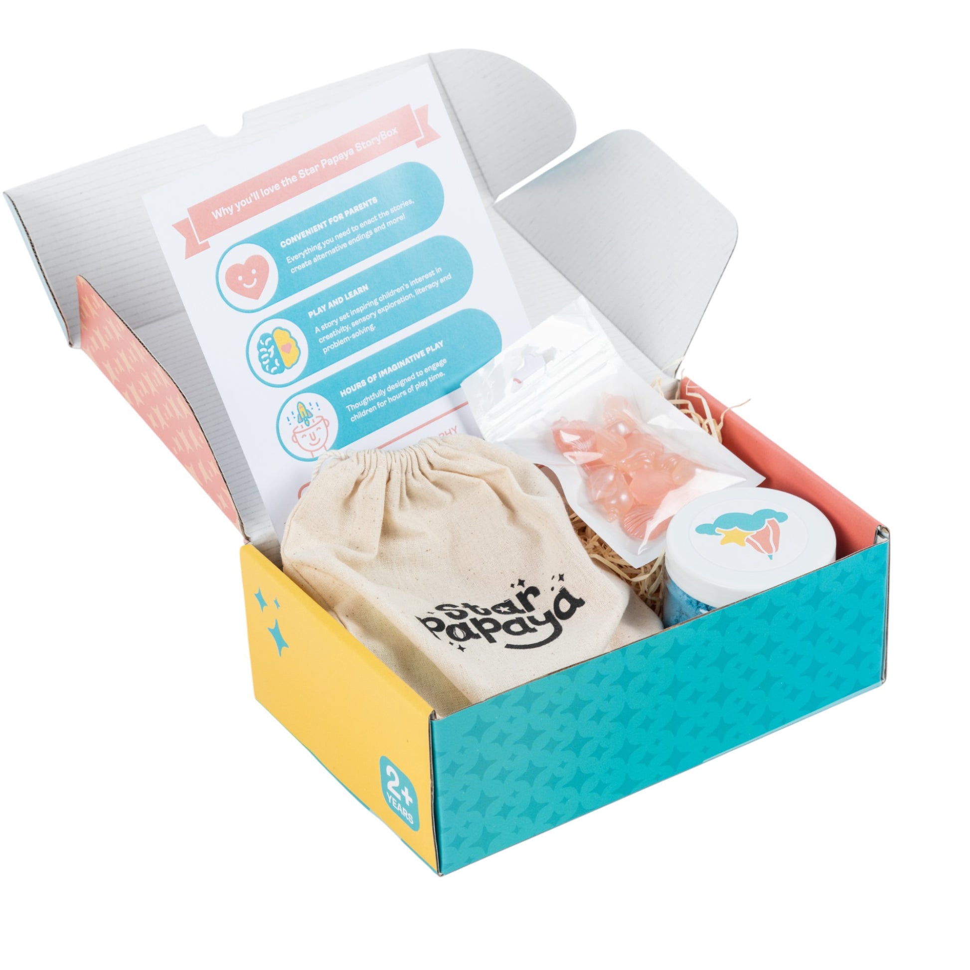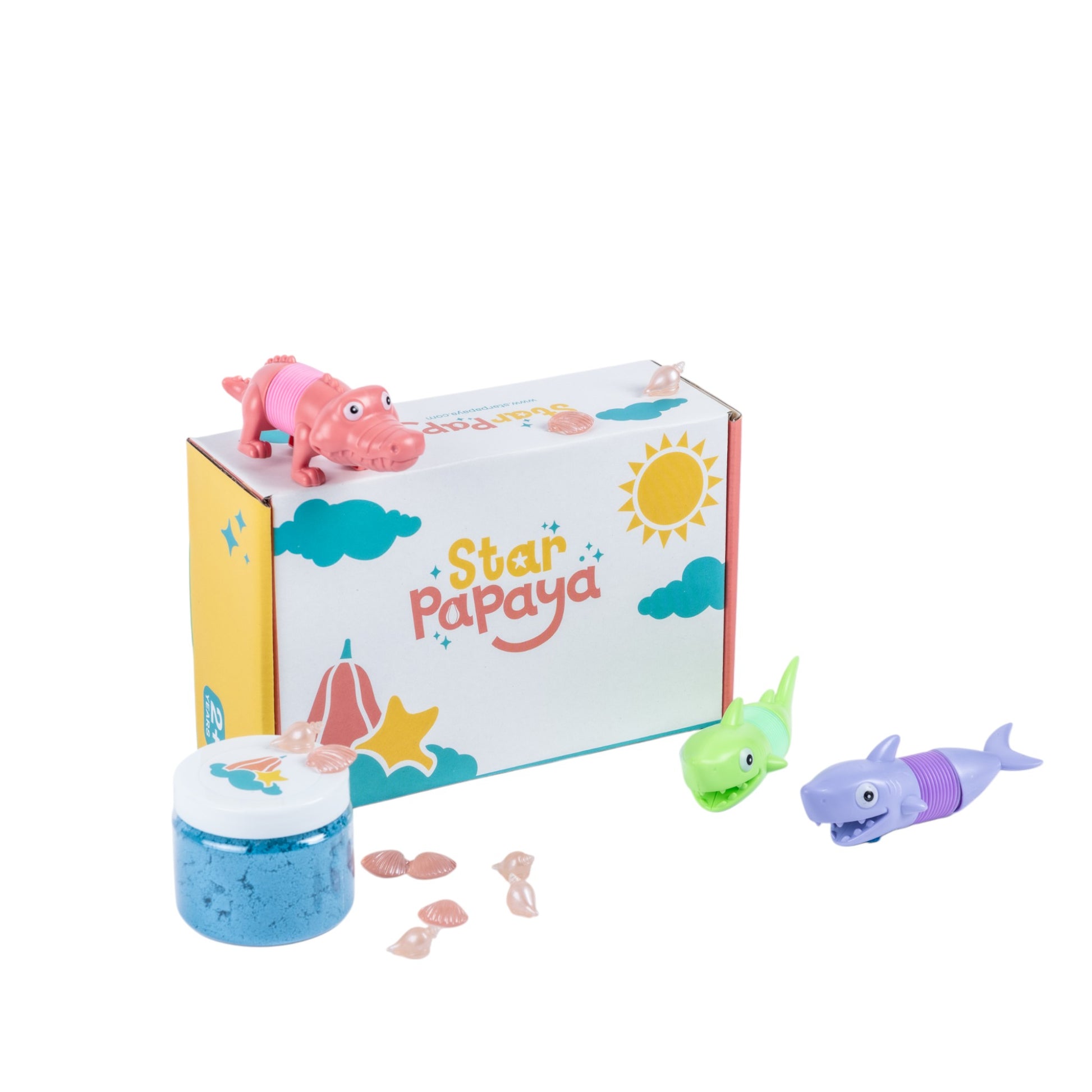 The Star Papaya SensoryBox is a sensory play set designed for hours of pretend and sensory play. The SensoryBox includes themed characters, safe sensory materials and cute props.