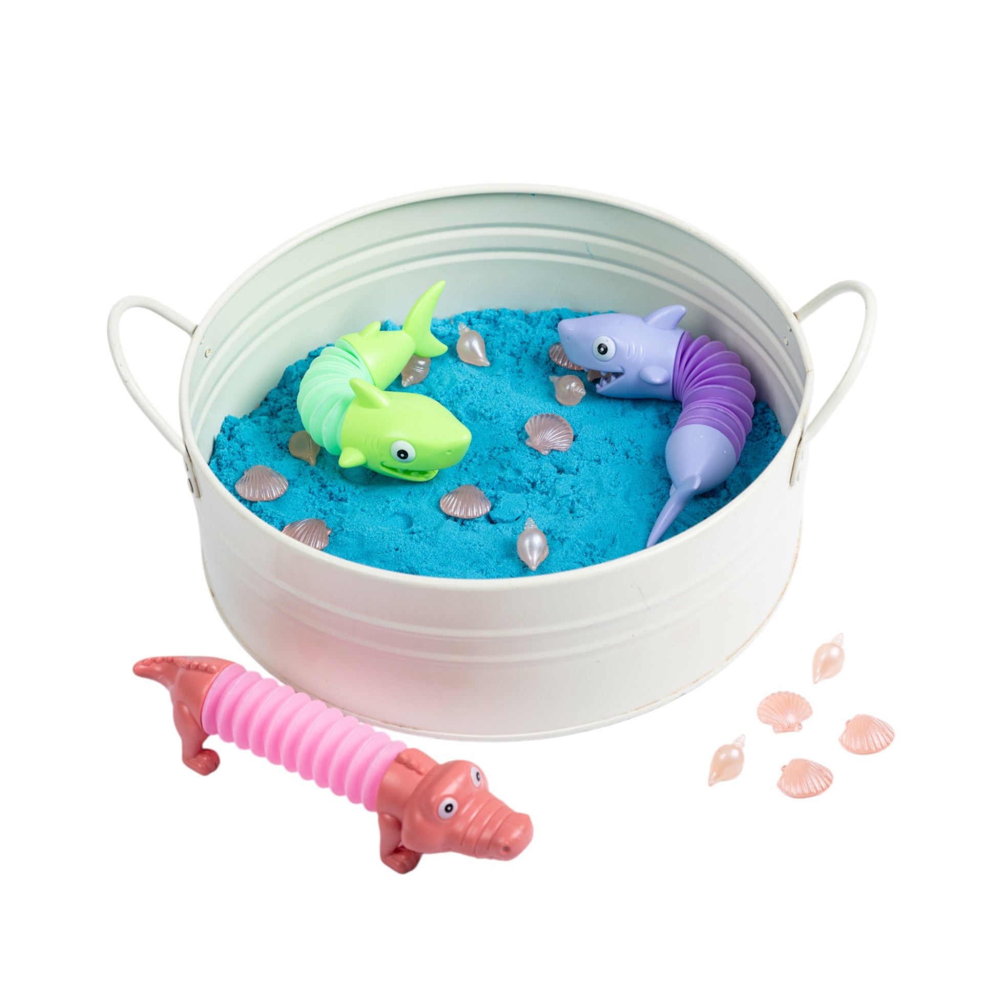 Explore the wonders of the ocean with the Sea Creatures on the Beach SensoryBox featuring three sea creature pop-tube toys and blue kinetic sand. Interact with the pop squid, stretchy shark, and long crocodile on a bed of blue kinetic sand. The child-safe shells add an extra touch of magical fun.