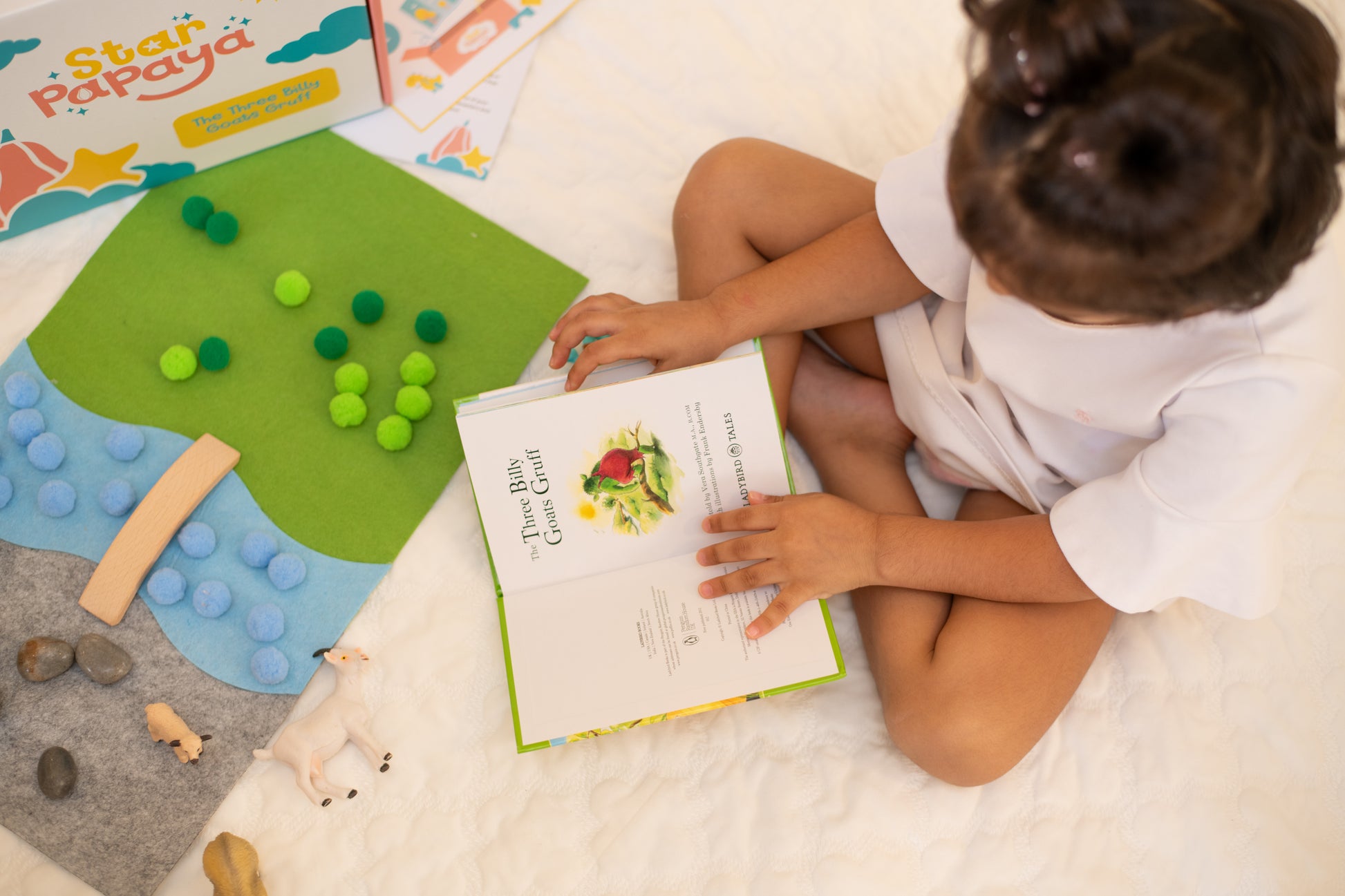 The Star Papaya StoryBox is an imaginative play set designed to bring your favourite stories to life. The StoryBox includes a story book, story characters, a hand-made play mat, and sensory props.