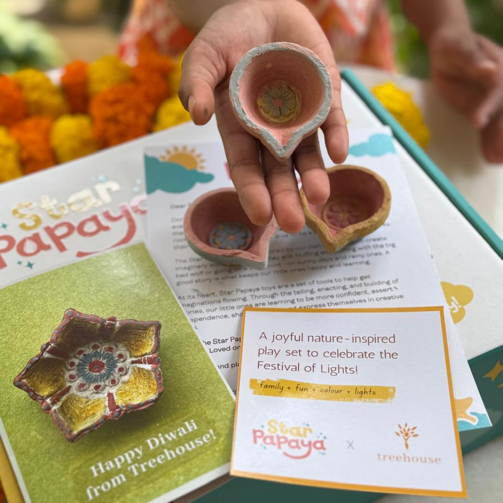 Star Papaya X Treehouse brings you a very special Festival of Lights PlayBox: a joyful, nature-inspired set designed to bring the magic and warmth of Diwali to life. The PlayBox includes a beautiful lift-the-flap story book about Diwali, a DIY natural paint kit with 5 diyas, a happy family of 5 wooden peg dolls and sensory rice. Every item invites your little one to explore creativity, our beautiful culture and feel the glow and joy of our favourite festival!