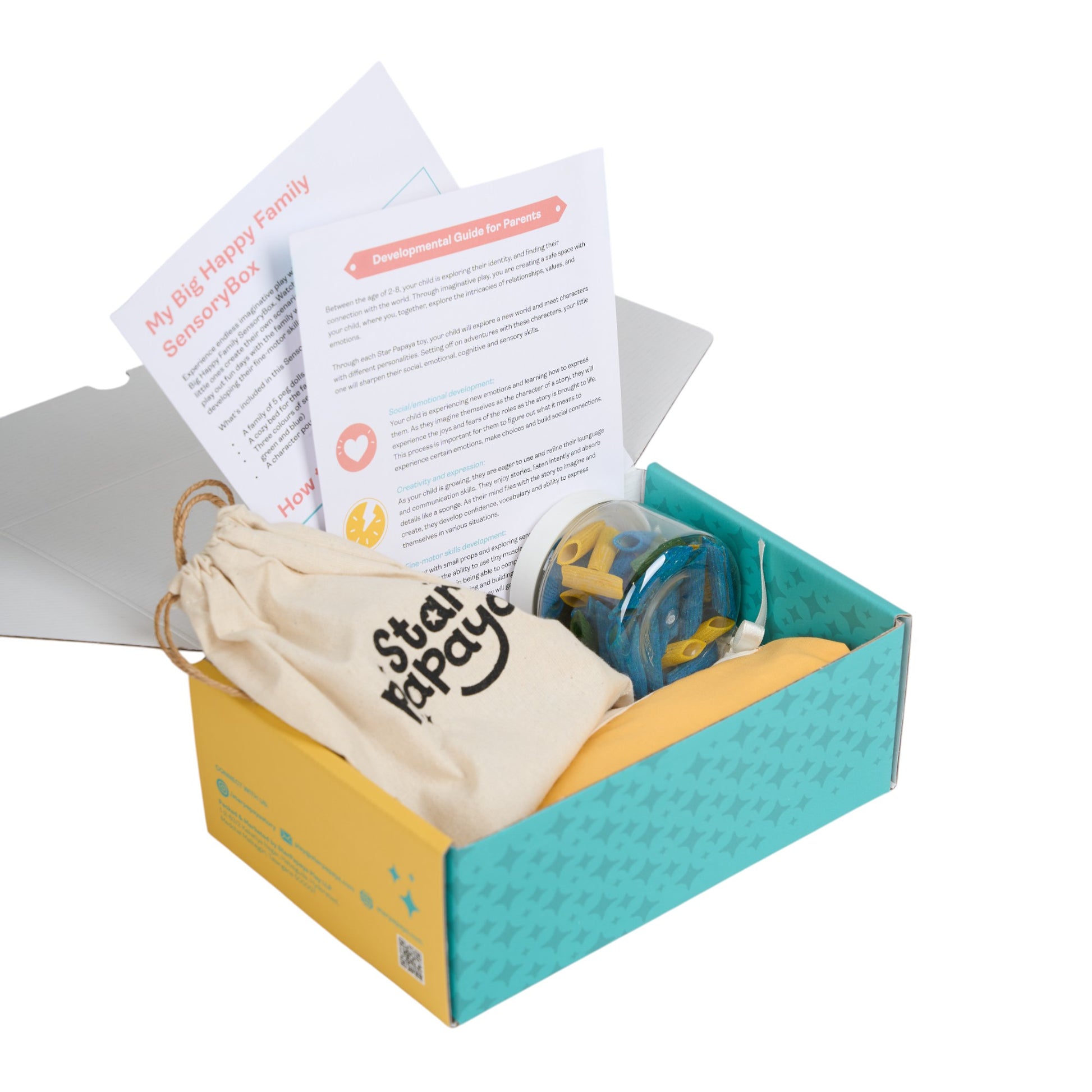 The Star Papaya SensoryBox is a sensory play set designed for hours of pretend and sensory play. The SensoryBox includes themed characters, safe sensory materials and cute props.
