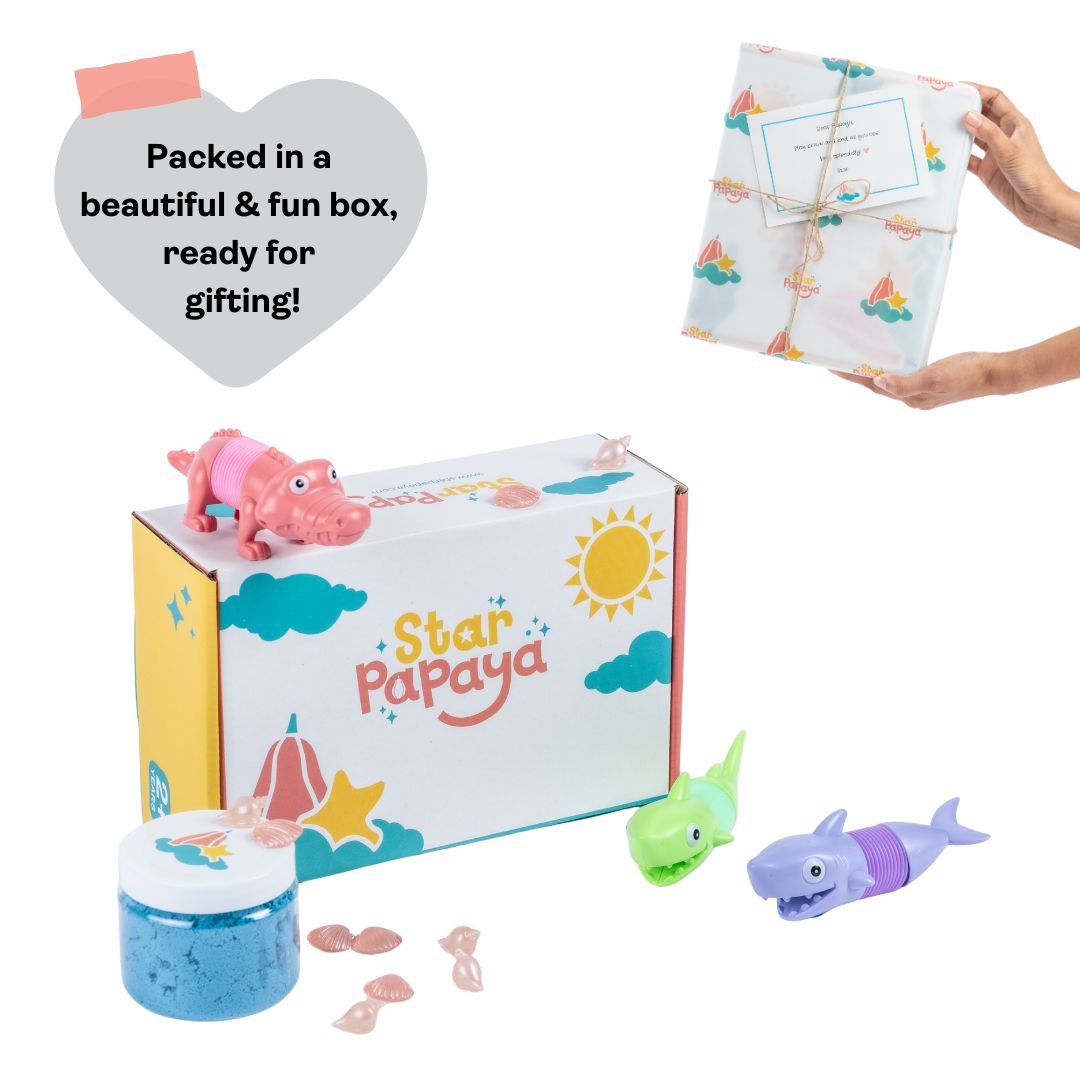 Explore the wonders of the ocean with the The Sea Creatures on the Beach SensoryBox featuring three sea creature pop-tube toys and blue kinetic sand. Interact with the pop squid, stretchy shark, and long crocodile on a bed of blue kinetic sand. The child-safe shells add an extra touch of magical fun.