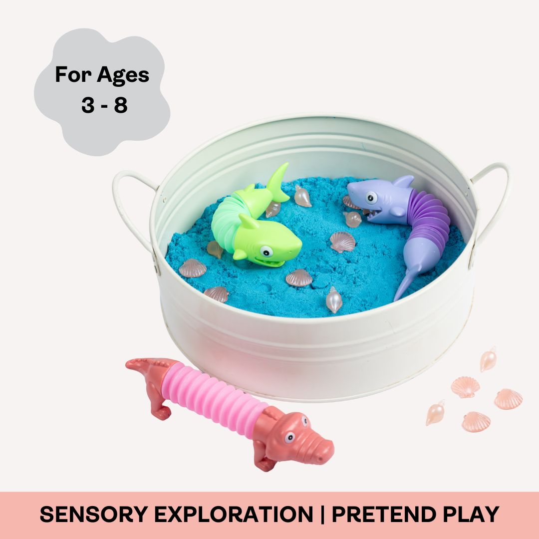 The Sea Creatures on the Beach SensoryBox turns everyday sensory play into an ocean adventure. As children stretch the pop-tube animals, bury shells in the sand, and create underwater stories, they engage their senses, imagination, and fine motor skills all at once.