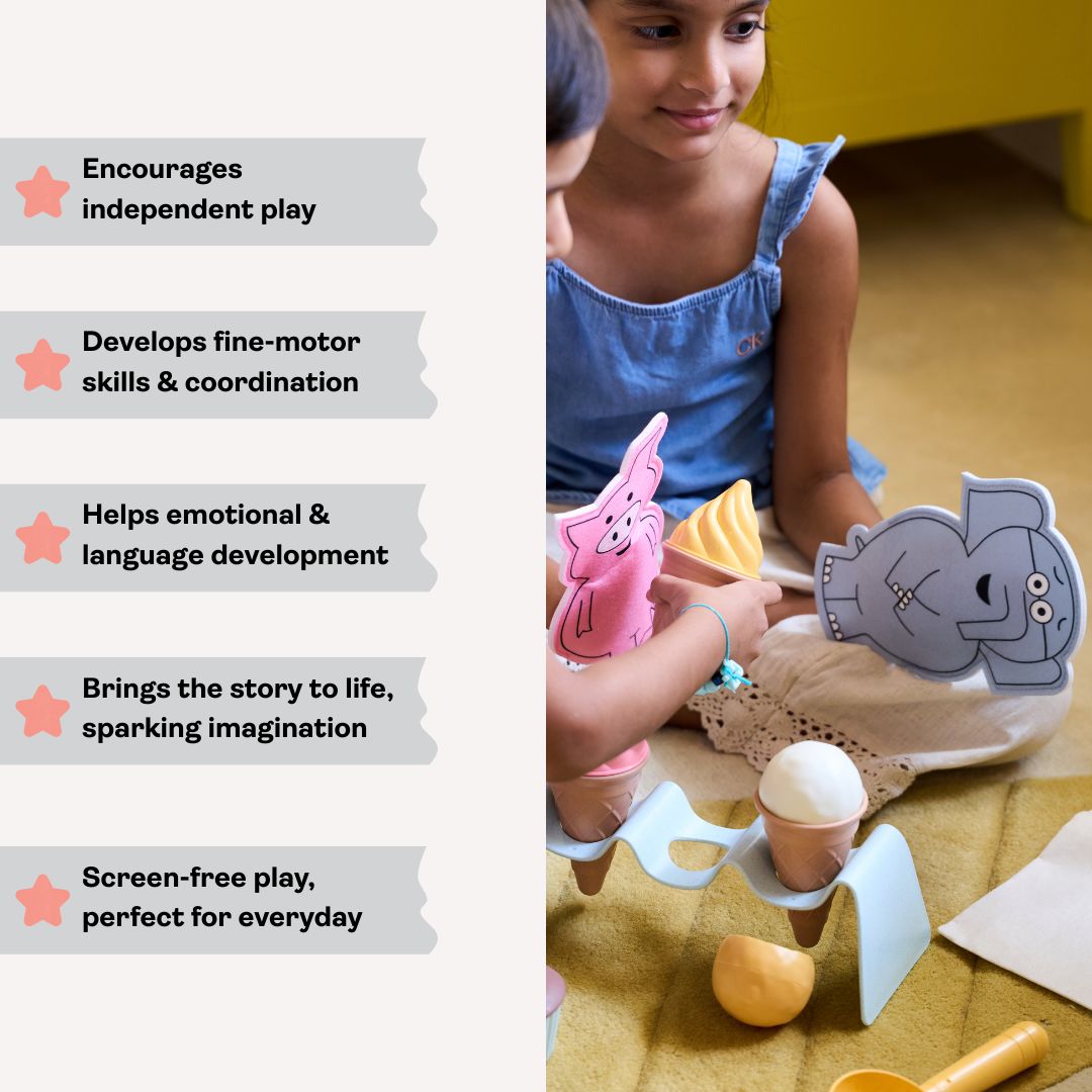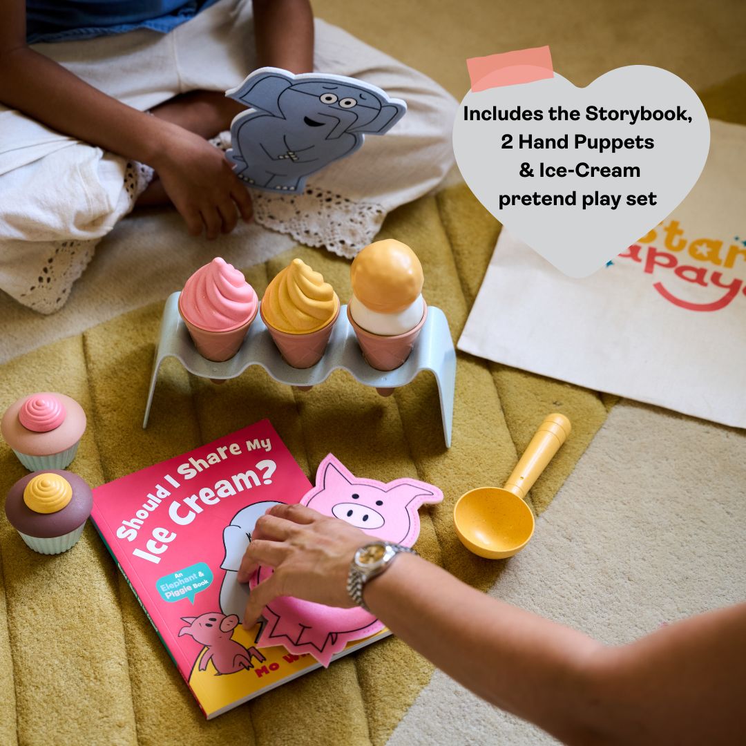 Through the The Should I Share my Ice-cream StoryBox, your child will join Gerald the Elephant as he faces a big (and very relatable!) decision — to share or not to share. With adorable hand puppets of Gerald and Piggie and a pretend ice-cream set, this StoryBox brings Mo Willems’ charming story to life while encouraging conversations around kindness and friendship.