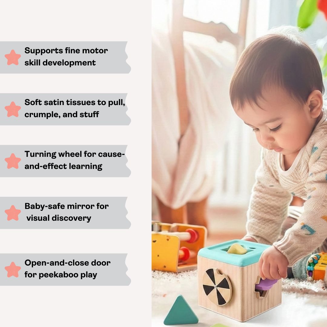 Spark curiosity and joyful discovery with our Slot & Pull Tissue Box — a multi-sensory wonder designed especially for little hands. Thoughtfully crafted from sturdy, baby-safe wood, this engaging activity box invites babies to pull silky satin tissues, slot shapes, spin wheels, and explore peekaboo doors and mirrors.
