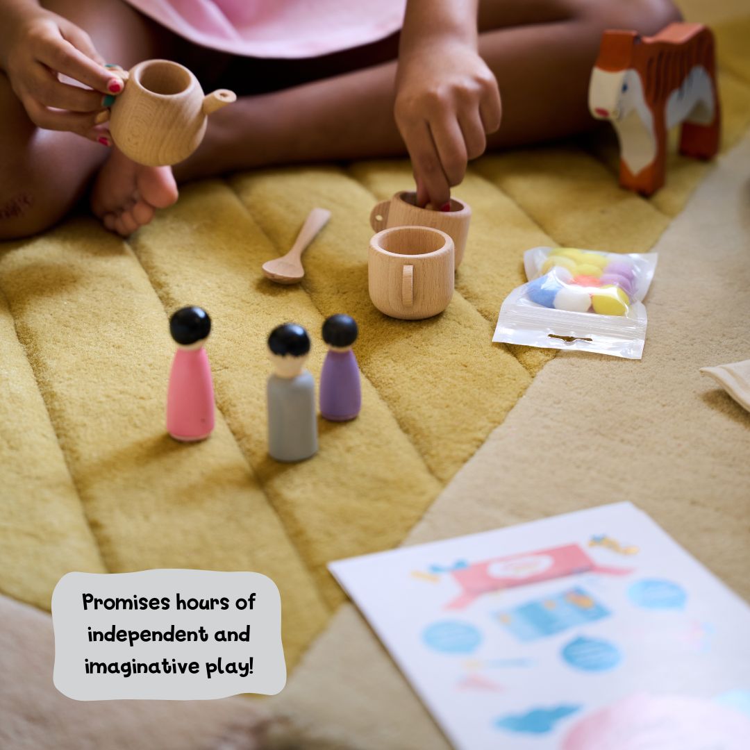 Sensory & Fine Motor Skills - The wooden tea set, peg dolls, and sensory pom poms invite hands-on exploration: