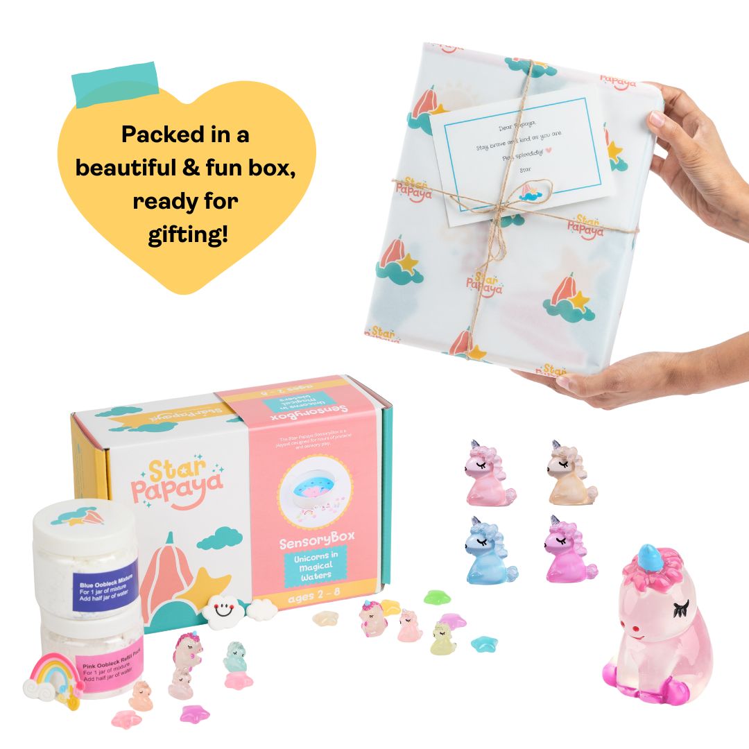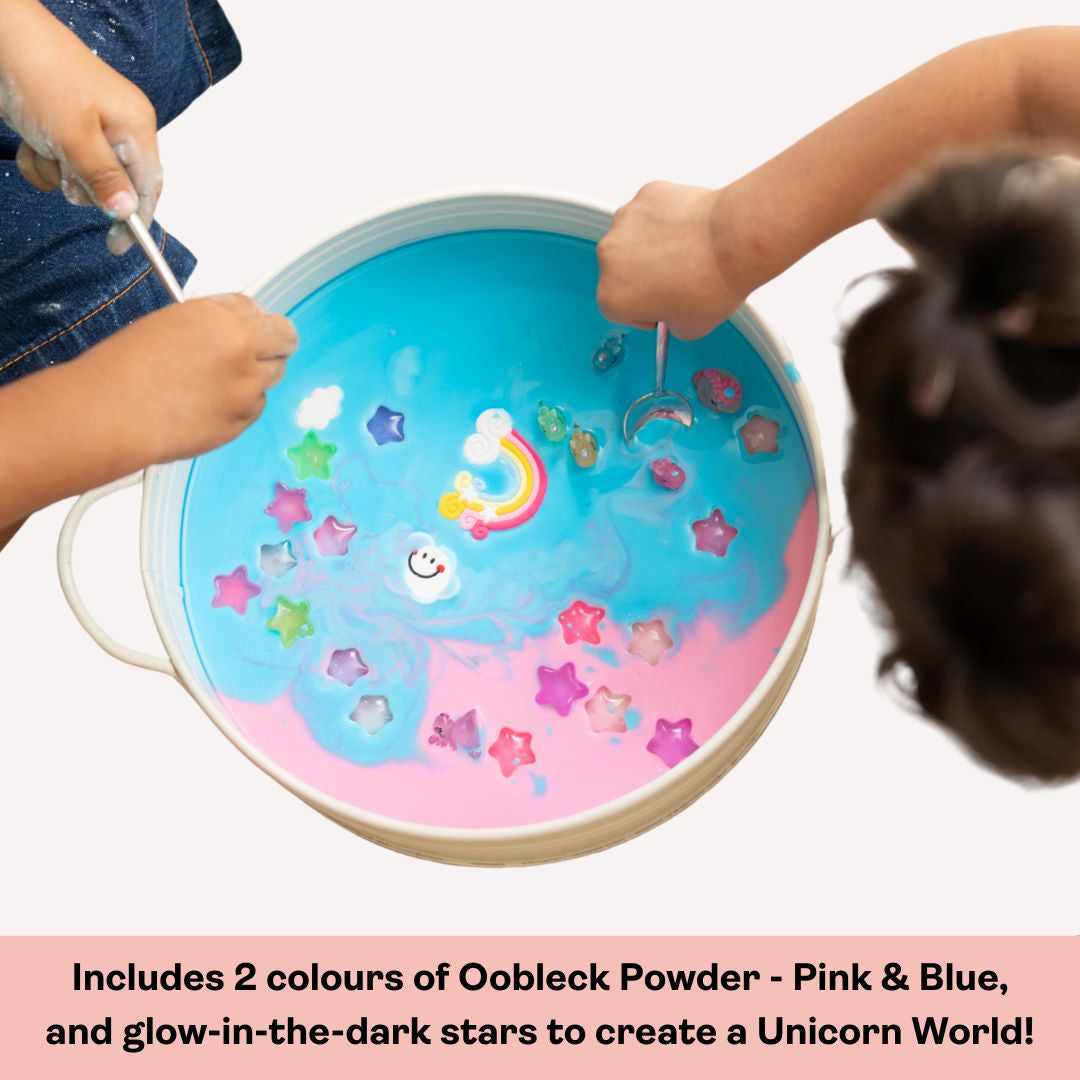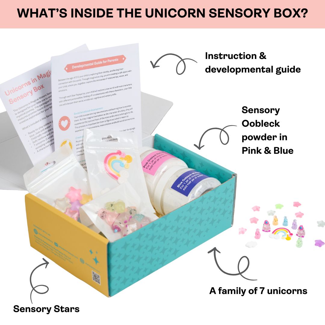 The Unicorns in Magical Waters SensoryBox comes with a small family of unicorns, squishy rainbows and clouds, and glow in the dark stars for your little one to embark on a mystical journey. Pre-packaged Oobleck mixtures promise hours of sensory and creative exploration for your little one.